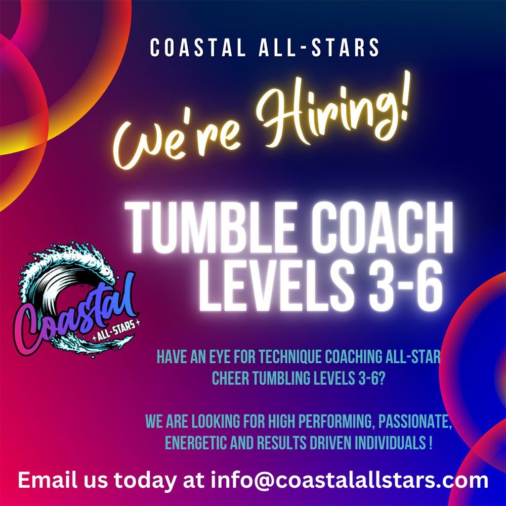 Coastal All-Stars is growing and looking for dedicated individuals to join our staff. Do you have the desire and passion to coach All Star cheerleading teams, help athletes to learn and perfect tumbling skills or help to build strength and conditioning of our athletes. Then please contact us at info@coastalallstars.com.